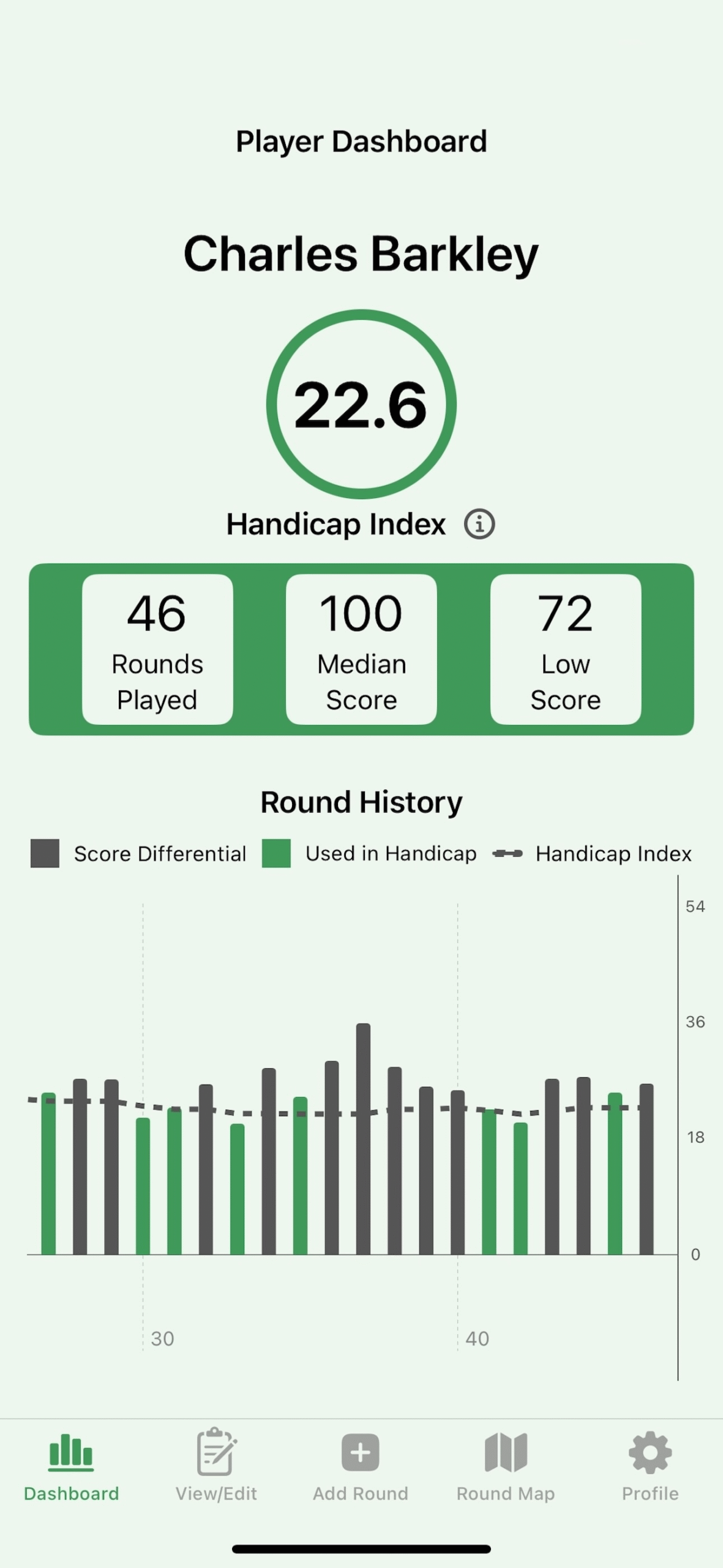 The player dashboard provides an intuitive way to visualize your handicap. Simply enter your scores into the app, and your handicap differential and index will be automatically calculated.